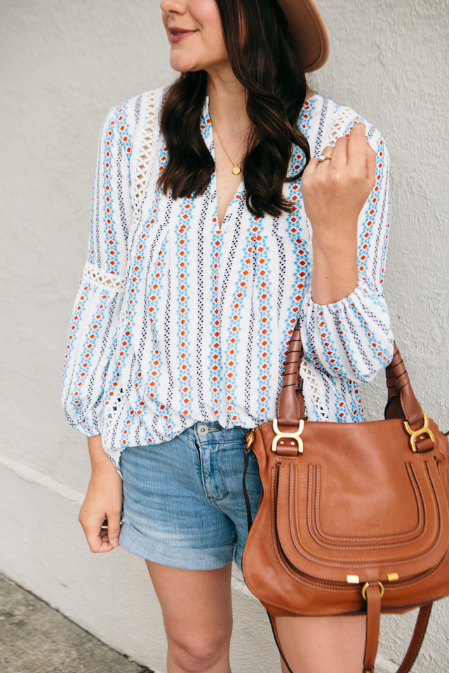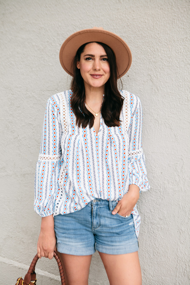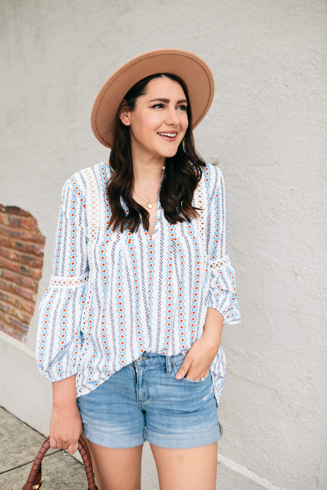 This top was probably the favorite of the try on from last weekend’s Amazon haul. It’s actually my favorite, too — so I’m glad that we are all on the same page! I didn’t think I’d like it as much as I do once I got it in but I find myself throwing this exact outfit on a lot. This printed top is lightweight and easy to wear with jeans, white jeans, cut-offs or denim shorts, or even a tailored pair of shorts! I’ve linked a few options below if you like this top but maybe aren’t a fan of denim shorts! As far as the cut outs go, I don’t feel like I need a camisole or anything for extra coverage. It fits true to size, but is loose fitting. You can find my top here.