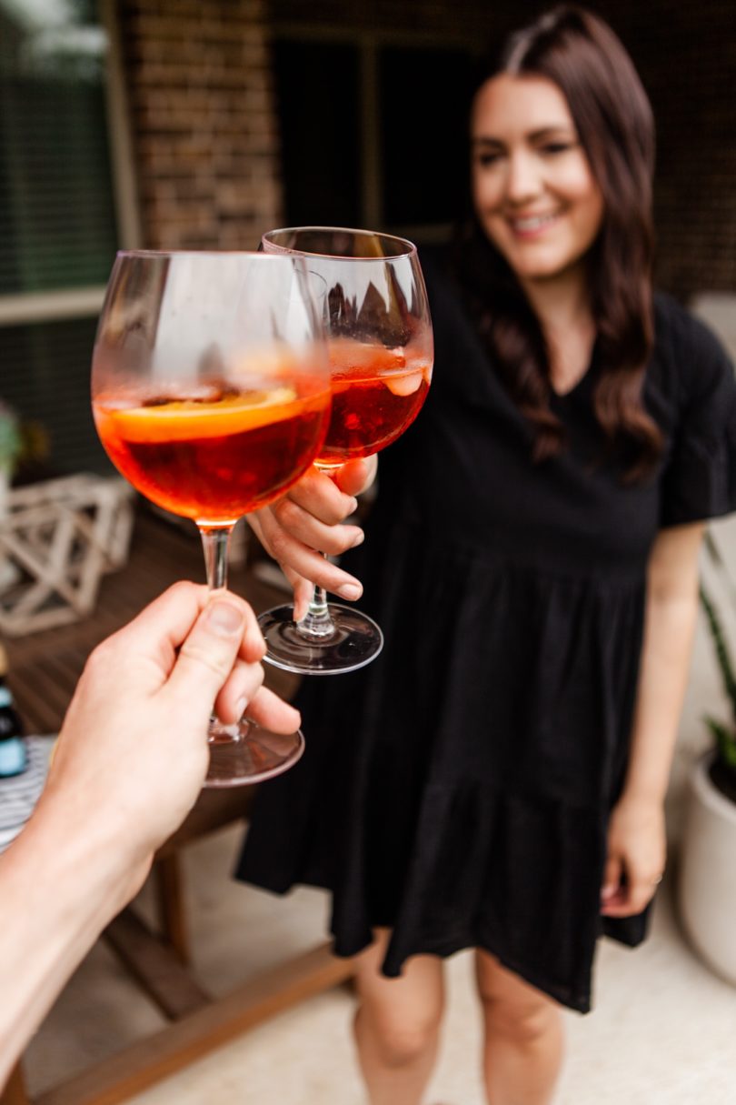 This may be the easiest drink to make and you can NOT mess it up. However, if you do mess this up, I’m going to need you to pass the bartending duties to a friend, ok? Pour the Prosecco, then Aperol (I prefer 2 oz) and a splash of soda into a glass. Make sure your soda is fresh, too! You’re going to want the bubbles. Lightly stir, THEN add your ice. Add a slice of orange as a garnish, if you fancy like that.