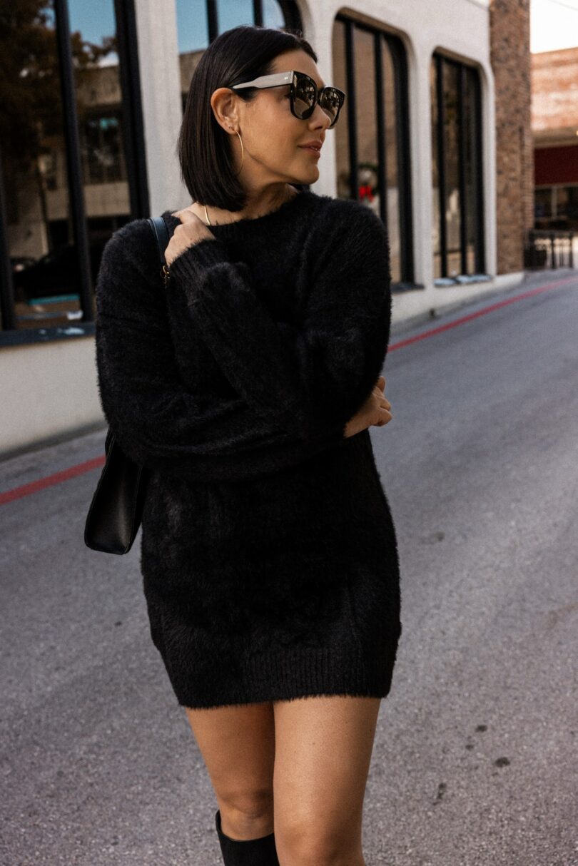 I don’t want to brag but I have unusually good luck with Amazon finds. Maybe it’s because I shop for a living (literally) and I know what to look for or maybe it’s just sheer luck. Sure I get my fair share of duds but this dress is the opposite of a dud. It’s a true gem. On the surface it looks like a black sweater dress…and it is, technically speaking. But it has that fun eyelash sweater fabric that has a little bit of a sheen, it’s stretchy and cozy all in one. And if you don’t want to go the fancy route with it, then just pair it with leggings! Especially if you are on the taller side because this dress is on the shorter side. I wore 3″ biker shorts underneath (these in fact) just in case. I don’t want to go into the details of what a ‘just in case’ case is, but I think we all understand this statement.