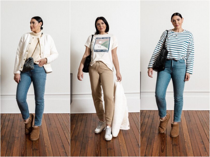 I think these were my stand-out favorite outfits from the but honestly, I loved everything in this capsule. I would truly wear every singly one of these outfits any day of the week. Also –anything with the fur vest I am obsessed with. I received this vest as a gift last year as a partner with J.Crew Collective and I’ve been wanting to style it in my ‘everyday’ aesthetic. I feel like I did that in this capsule. It was actually the piece that was a non-negotiable; the vest had to stay. I also loved adding in some cozy January pieces like the joggers and the leggings and the Uggs. I feel like those three things are quintessential for me in January. The holiday sparkle hangover is real and I lean hard into these soft pieces in the winter.