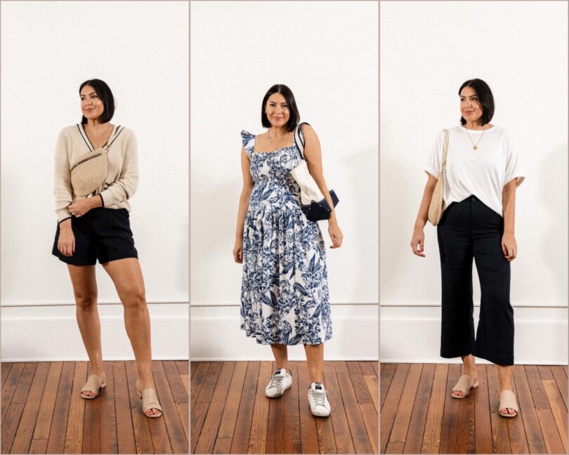 This month I went with all of my favorite pieces, no surprises. I brought back a few pieces from my March capsule (the shorts, the anorak) and added in a few new pieces I’ve picked up over the last few weeks. This Abercrombie dress for one is a favorite. We have a Florida trip coming up and that will definitely in my bag. I added in this tee from my Essentials post, because it is after all an essential, and I tossed in my tried and true denim shorts. On the purses, I brought back this Clare V. Crossbody (a favorite from last summer!) and this J.Crew tote which will be on me from now until September 1st.