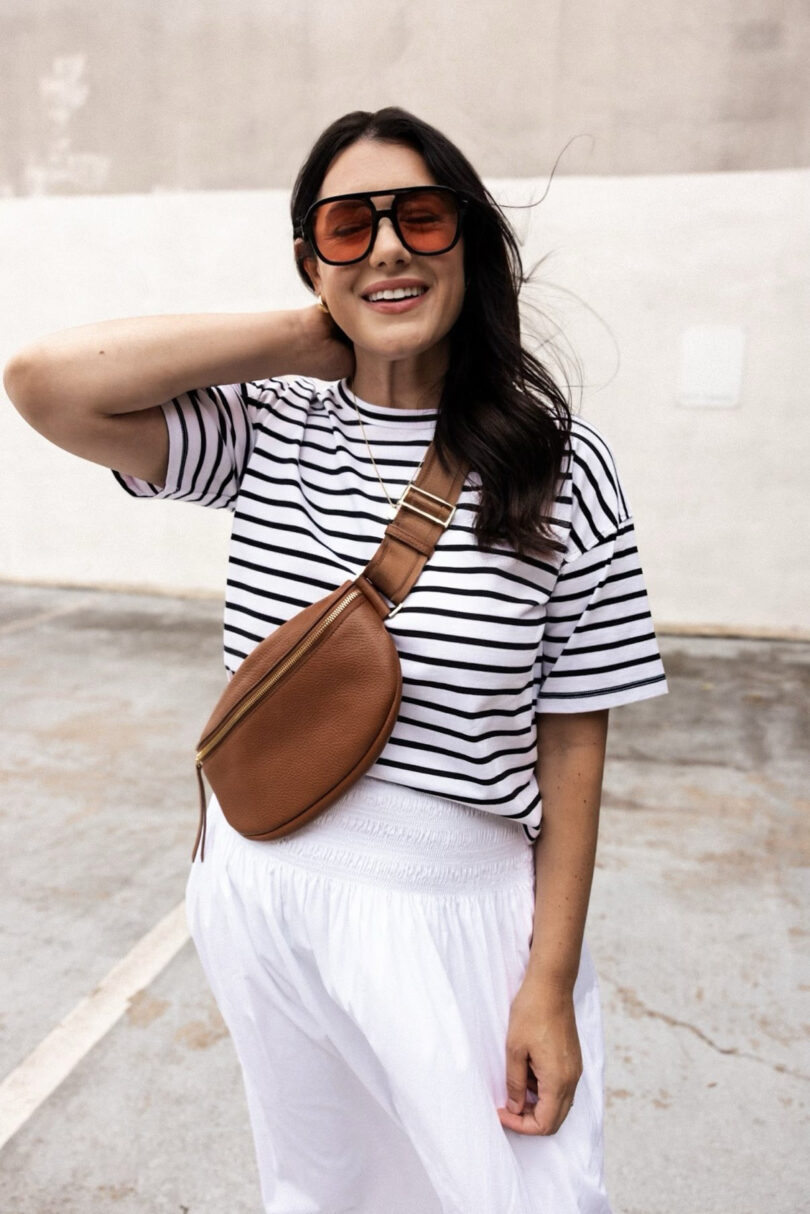 I am in the medium of the skirt — it definitely runs loose! Which I personally don’t mind, the waist is looser and with stretch. That alone makes this a win for me. I am in the medium and it fits great. Just keep that in mind, if you are in between sizes or if you have a slimmer waist, you may want to size down. Find it here in white or black!
