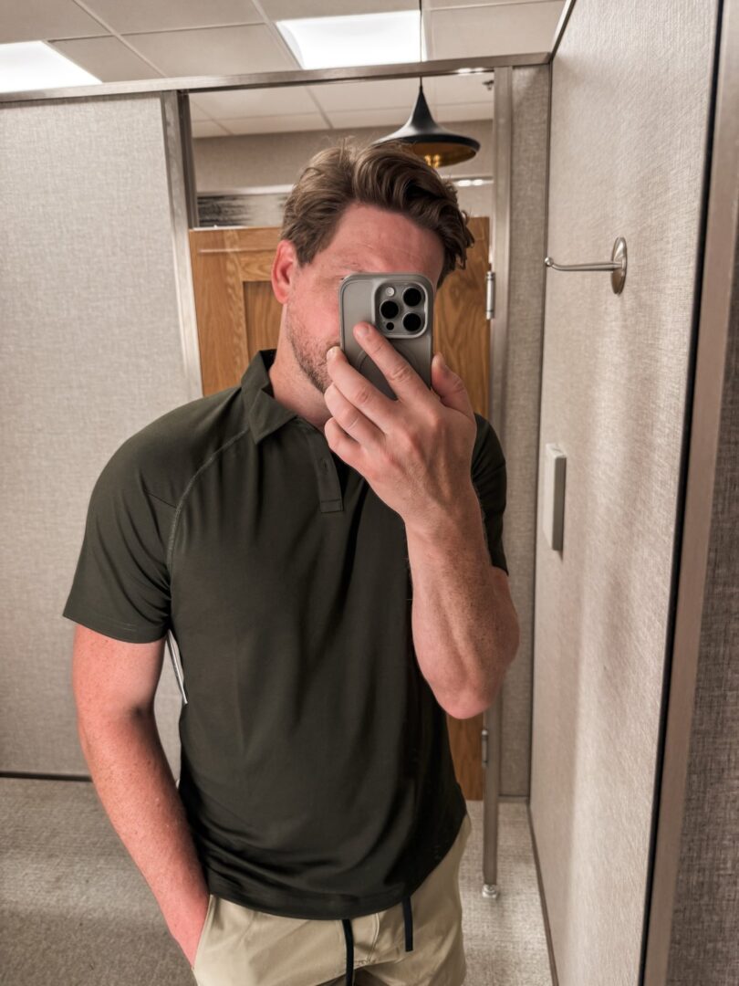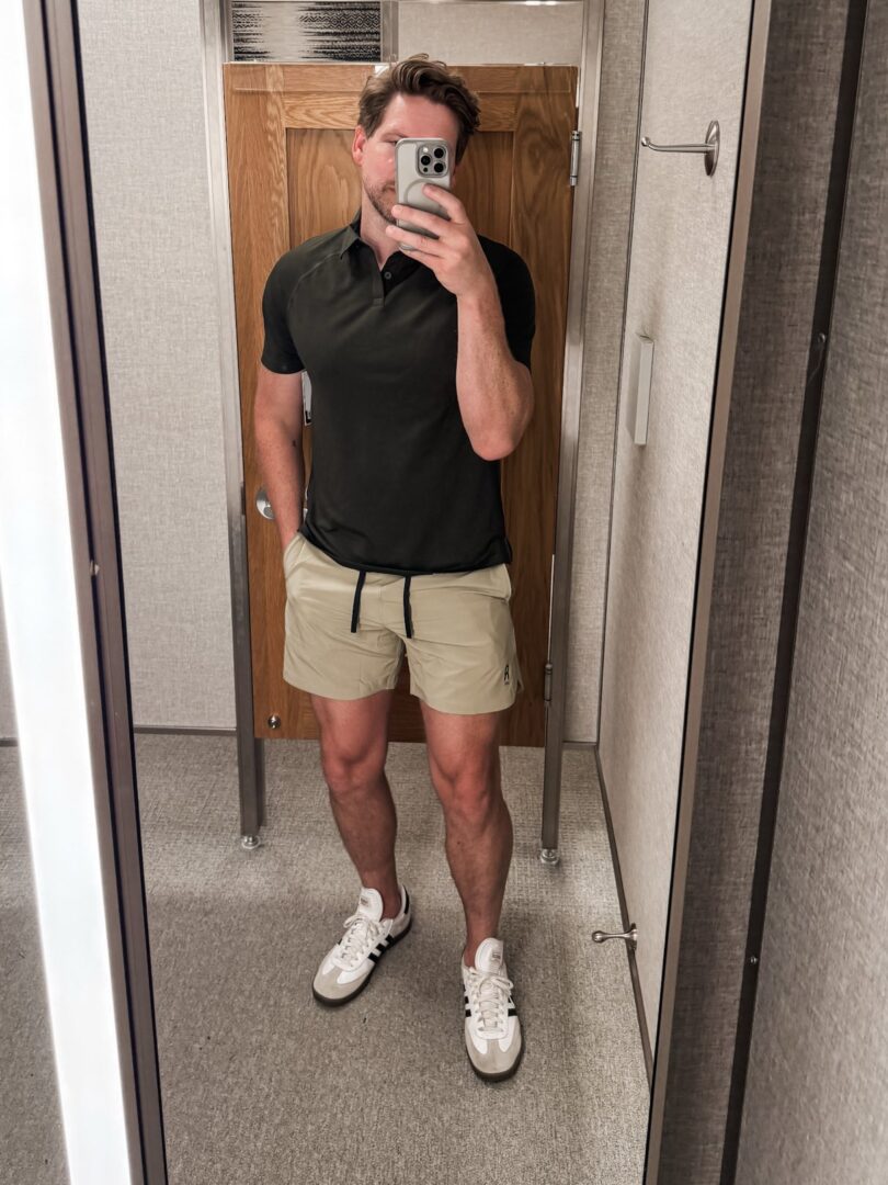 Now he would typically wear this shirt with work pants to work or to travel in but here are some matching shorts also from Rhone. He is in the medium, fit is TTS. These are for the gym but this top is very versatile (another great reason for these polos, very easily interchangeable!) Find the shorts here.