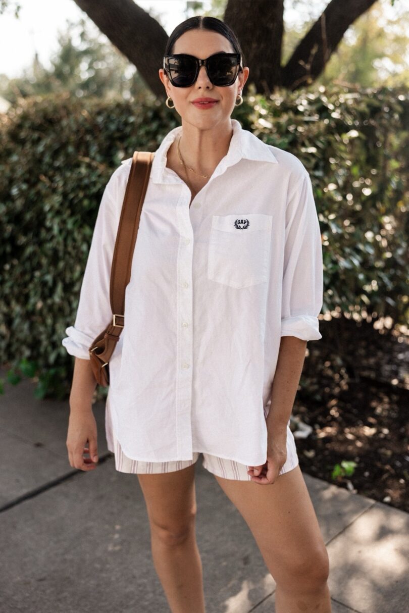 I paired my very favorite oversized poplin from Gap (the one I linked here doesn’t have the emblem but it is the same top!) with this pair of boxer shorts from Amazon. They are not the same as men’s boxers, as these are a thicker fabric that hold the shape, not loose cotton or in any way like pajamas. They have way more shape than regular underwear boxers, just in case you were wondering. I am in the medium of the poplin as it runs very oversized and I’m in the large of the boxer shorts. PS my top is on sale right now, too!