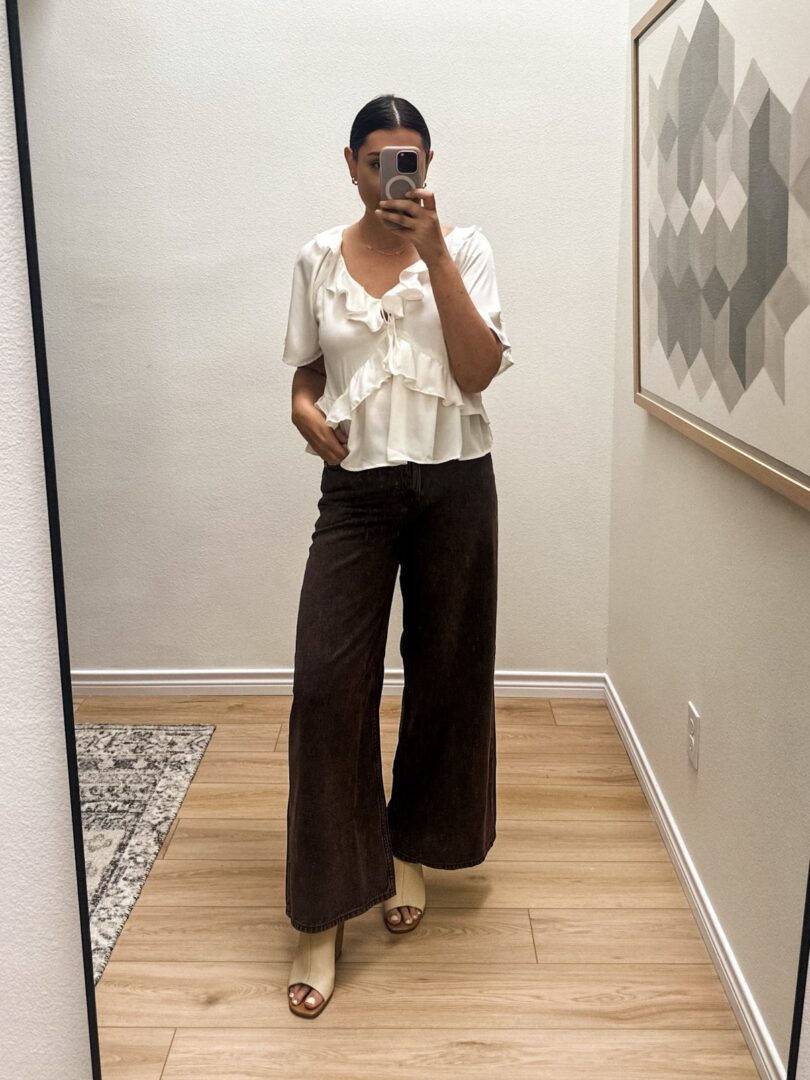 I’ve had my eyes on these for a while but I was going back and forth between their many different rinses and hues. At first I thought just go with blue denim but then I realized I have a lot of blue wide legs, so let’s go with this brown for fall. And girl, it’s the right choice. It’s this deep chocolate acid wash rinse and they are so soft. I don’t know if I would say ‘ultra soft’ that seems like a reach but they are a softer denim and they have a nice flowy fit. They are a true mid-rise as well, if you don’t love a high rise. I am in the 29, true to size fit with a hint of stretch. I do think they’ll stretch out over time as well.