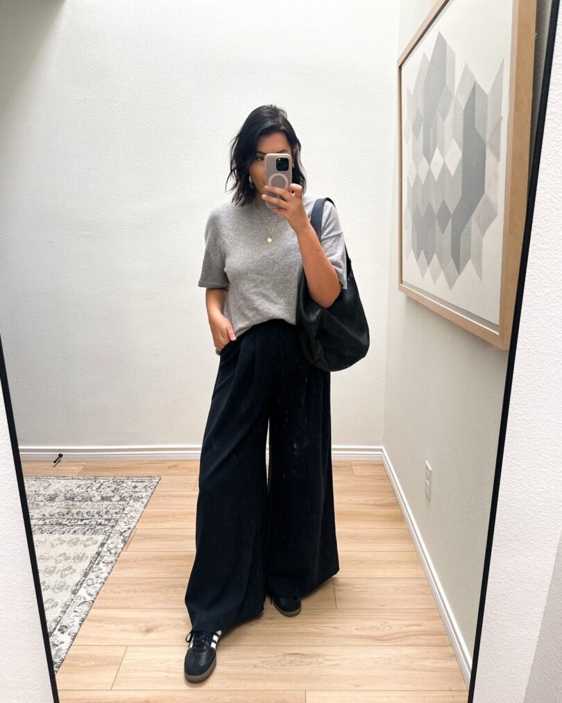 I should mention that my sweater tee is back in stock! It’s 30% off through Monday, too. I’m in the medium, it fits loose / oversized just like on the model. This is just one of those outfit I know will work. Pants are navy here but they’re the same fit as the ones I linked above!