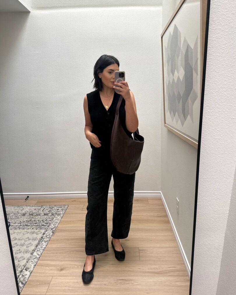 This outfit started with different intentions. I was going for a sweater over the shoulders combo, trying to emulate an outfit from Pinterest, but ended up just grabbing this sweater vest for ease. I tossed it on and thought ‘good enough!’ and out the door I went. I grabbed my dark brown bag just to break up the all black look and really like this vibe. I could have swapped my flats for a dark brown shoe, but it all works.