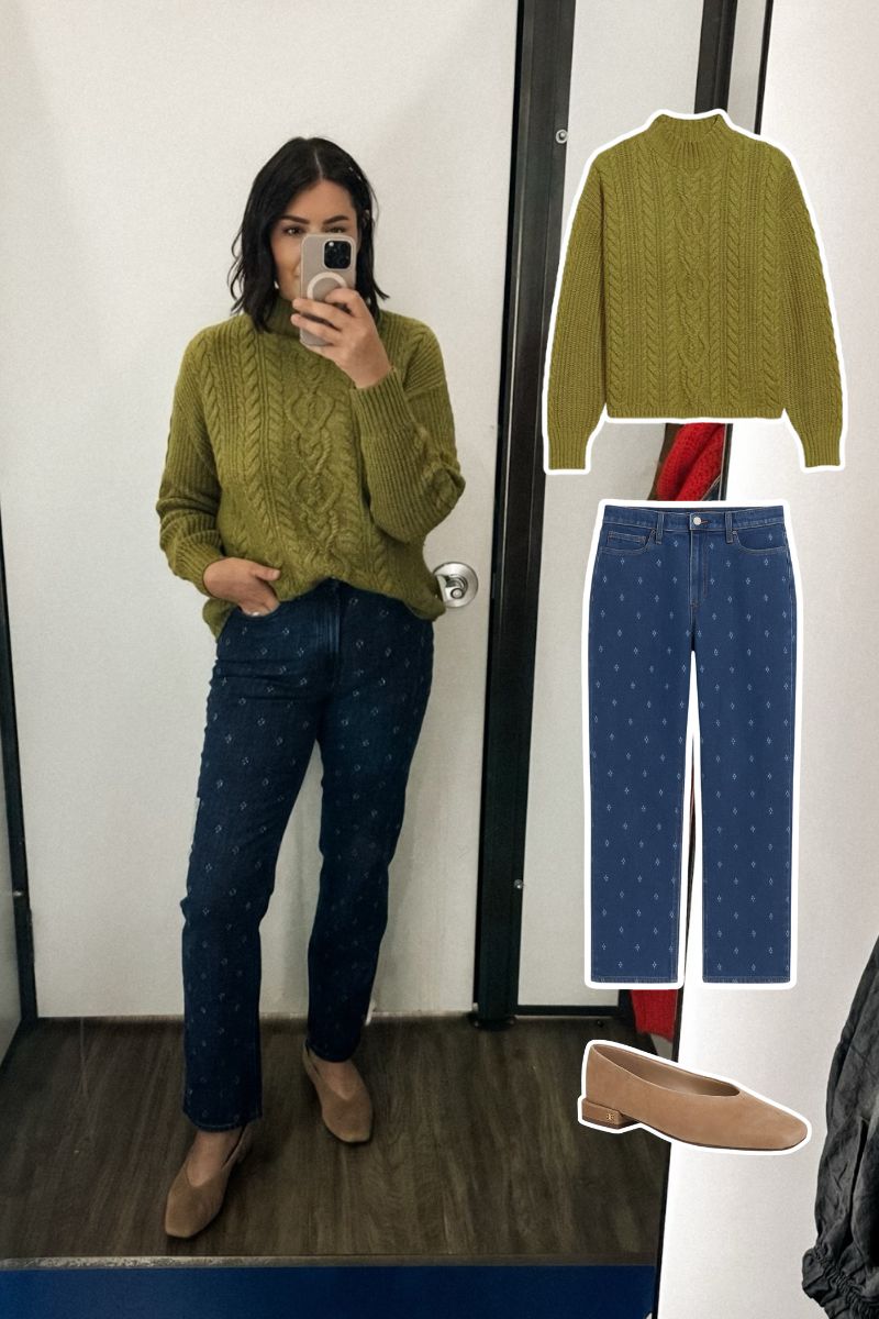 Trust me when I saw this color of green is prettier in person than it is online. I was immediately drawn to this sweater because of the color, but online it doesn’t read as pretty. It’s a vibrant olive green, not putrid like on their site. It’s more of what you see here but there are other colors, too. I am in the medium, it runs TTs, slightly cropped.