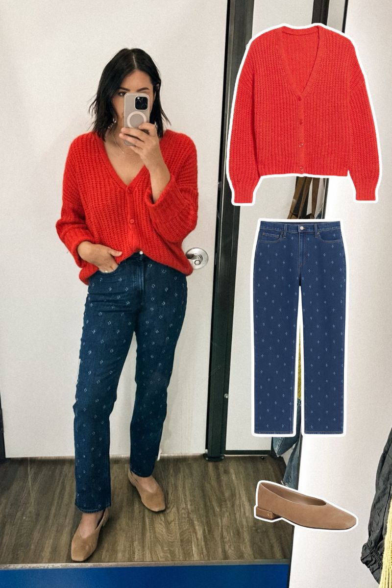 Perhaps you feel this way too? Perhaps that is why you enjoy try-ons or other style influencers? If that is the case, then I totally get it because shopping is not what it used to be. So anyways, I waltzed into Old Navy on Friday of last week not really knowing what to expect. The store was busy and packed with product, but not well merchandised at all. Stacks on stacks of clothing; none of it seemingly went together. Everything felt overwhelming. So I started with what caught my eye and it was this red cardigan. My immediate thought was “hey this looks like the the Emile Cardigan from Sezane.” And then I started finding piece after piece that looked just like something from a Sezane ad. I’m not even kidding you — these pieces could be mistaken for Sezane, especially styled just right.