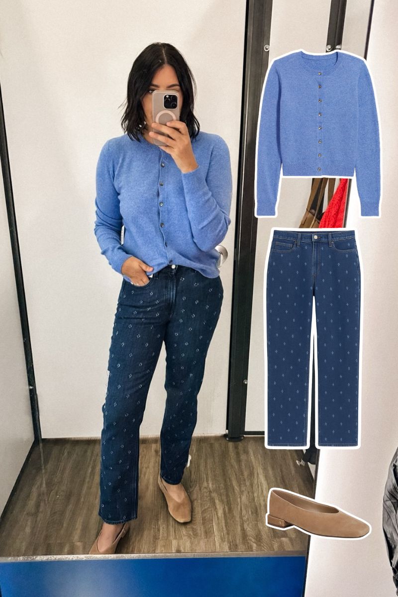 I LOVED this sweater but… only in this color. The pink and the ivory look cheap in person, the ivory being a bit thin as well. But this slate blue looks like Sezane and would look amazing with black jeans or dark denim. It’s such a dupe — I’m telling you! However, they did not have a medium at mine so this is the small. It is too small as it’s not supposed to be this fitted. So it is TTS, but my TTS wasn’t available.