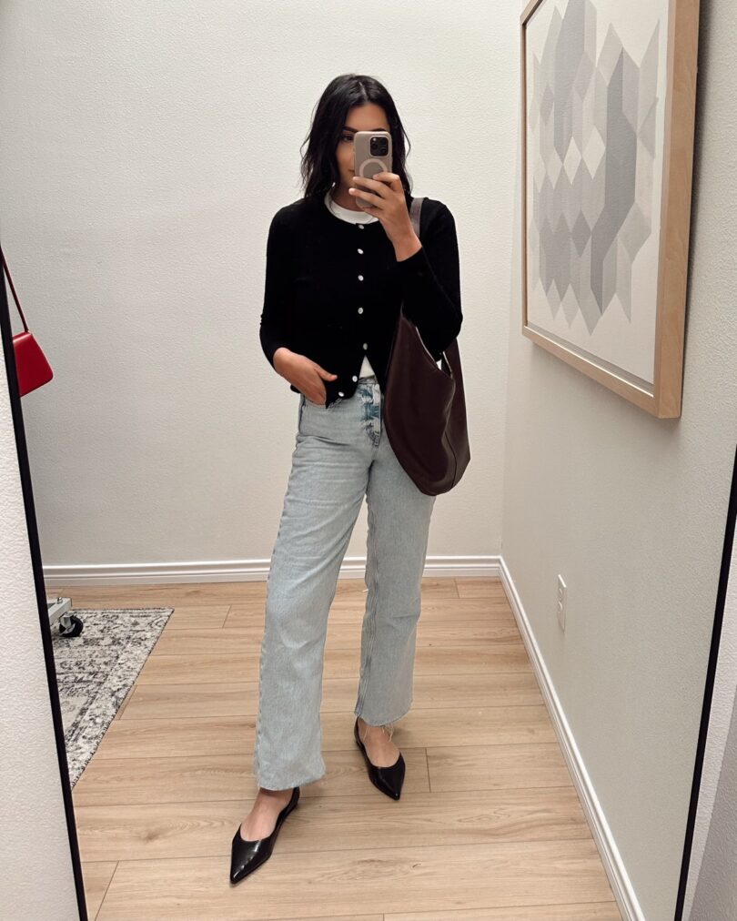 QUINCE CARDIGAN | GAP TEE | ZARA JEANS | ZARA FLATS | MADEWELL PURSE – similar