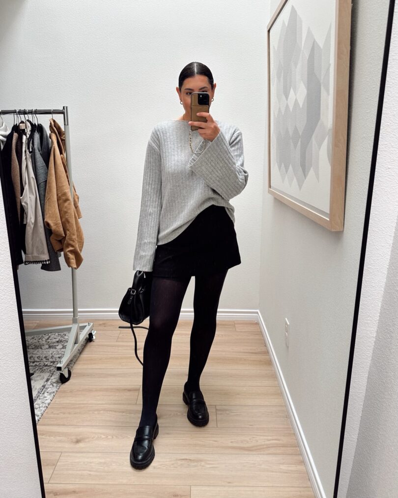 J.Crew Sweater | Gap Skirt (Similar) | Quince Bag | Similar Chunky Loafers | Opaque Tights