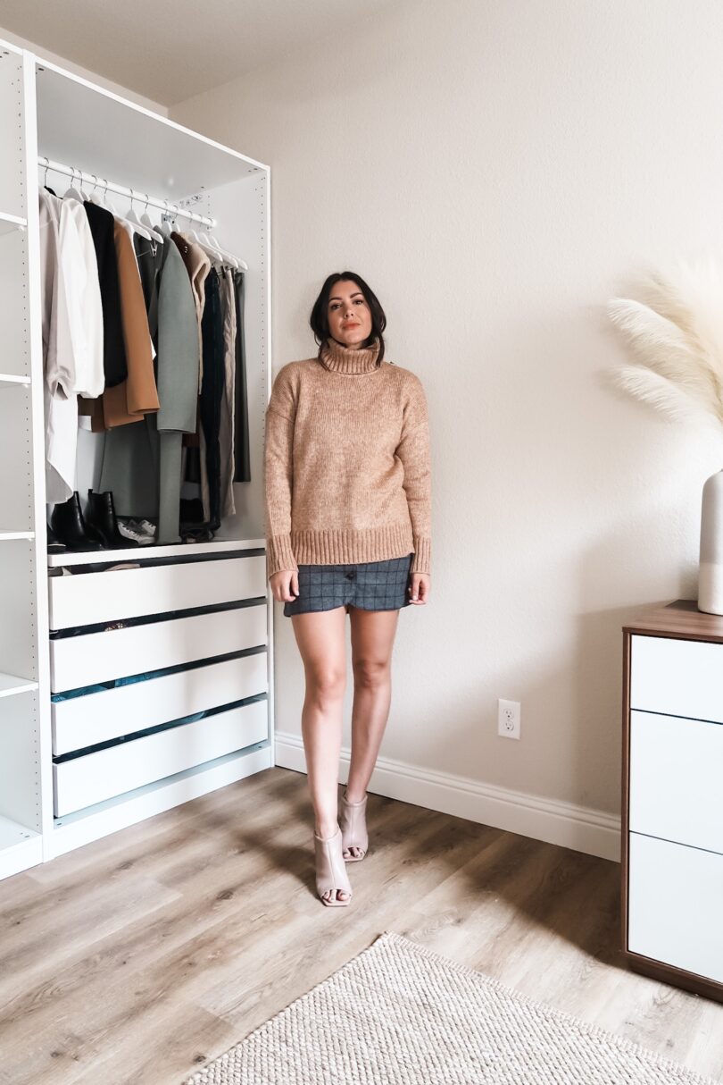 camel sweater + plaid skirt