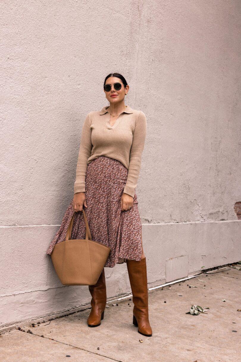 polo sweater + midi skirt + boots
