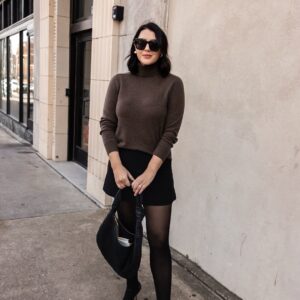 My skort is Gap (yes it’s a skort!) and actually sold out now but I’ve linked this one from Aritizia I really like as well. But let’s be honest, any black mini skirt works for this look. If you’ve got a black mini skirt, then you’ve got a black mini skirt. I don’t think there is anything special to this simple silhouette. I’ve had ones before from Old Navy, & Other Stories, Nordstrom, etc and to me they’re all about the same. As long as it fits and you like it, it doesn’t matter where it came from. I prefer a poly blend skirt with structure, because I find the color doesn’t fade versus a cotton or cotton blend. But that’s just me! That’s what’s really nice using classic pieces to create simple but effective outfits. This look is very re-creatable with simple classic pieces and I think that’s why I like it so much. It felt new to me but really I think it just classic and refined.