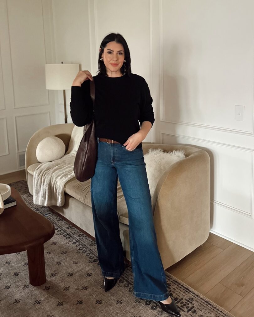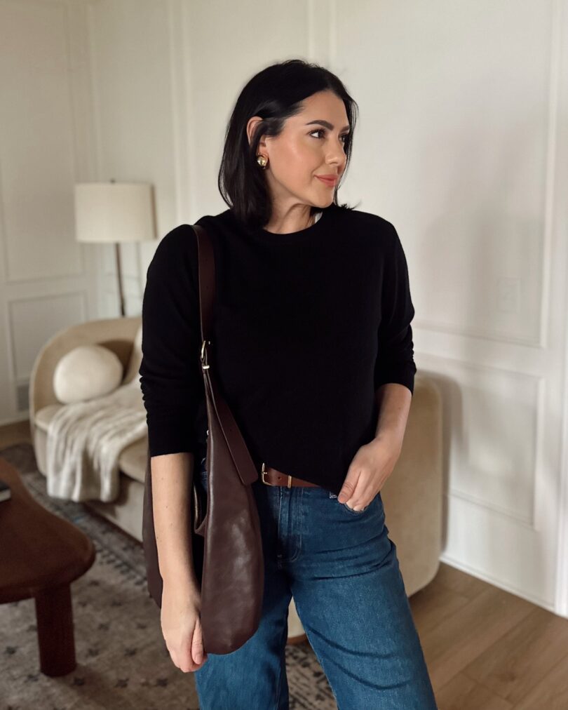 This sweater needs more accolades I’ve decided. It’s the famous $50 cashmere from Quince and it really is a nice sweater. It’s not quite as thick as the Mongolian cashmere sweater but very similar feel. The fit is slightly relaxed but I go up to a large for a looser fit. Tight sweaters are my nightmare. And there are so many colors you can choose from. Or you can be chic (boring?) like me and go with black.