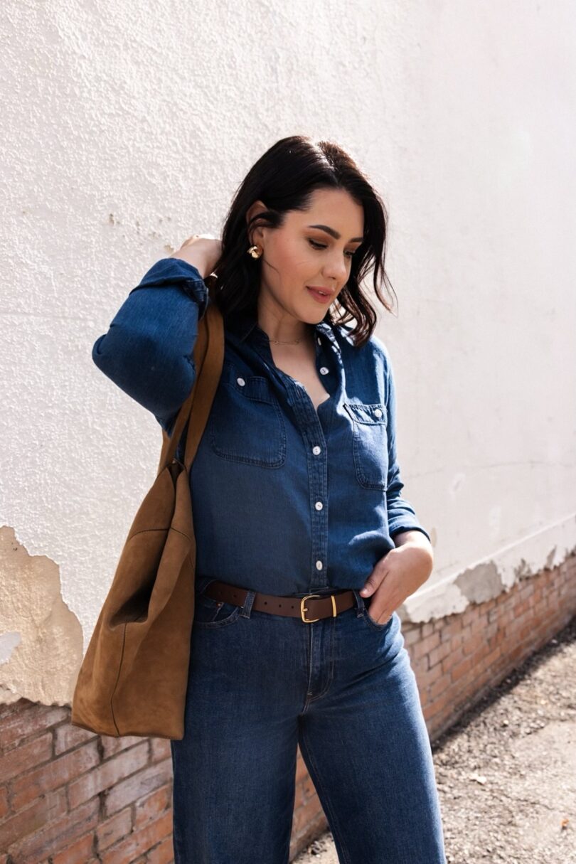 After the rush of the holidays, I tend to feel like a blank slate. And not necessarily in like a positive, ‘new year, new me’ way. More like an ‘oh no I deleted everything’ kind of way. You see, I’ve been a style blogger for as long as I can remember and so content is always top of mind. Something about January 1 hits and I think ‘ok…now what?’ when it comes to my content and my style. This is default for me, BUT in my later, wiser years I’ve realized that I don’t have to reinvent myself every year. And so I think I start leaning on the basics to build my content, especially when I don’t really know what else to do. What’s the most basic of style? Denim. And how do we elevate that basic? We double it. We layer it. We belt it and put giant earrings on and call it a day. I’m just getting back to my basics this January. Which is probably why I like this outfit so much.