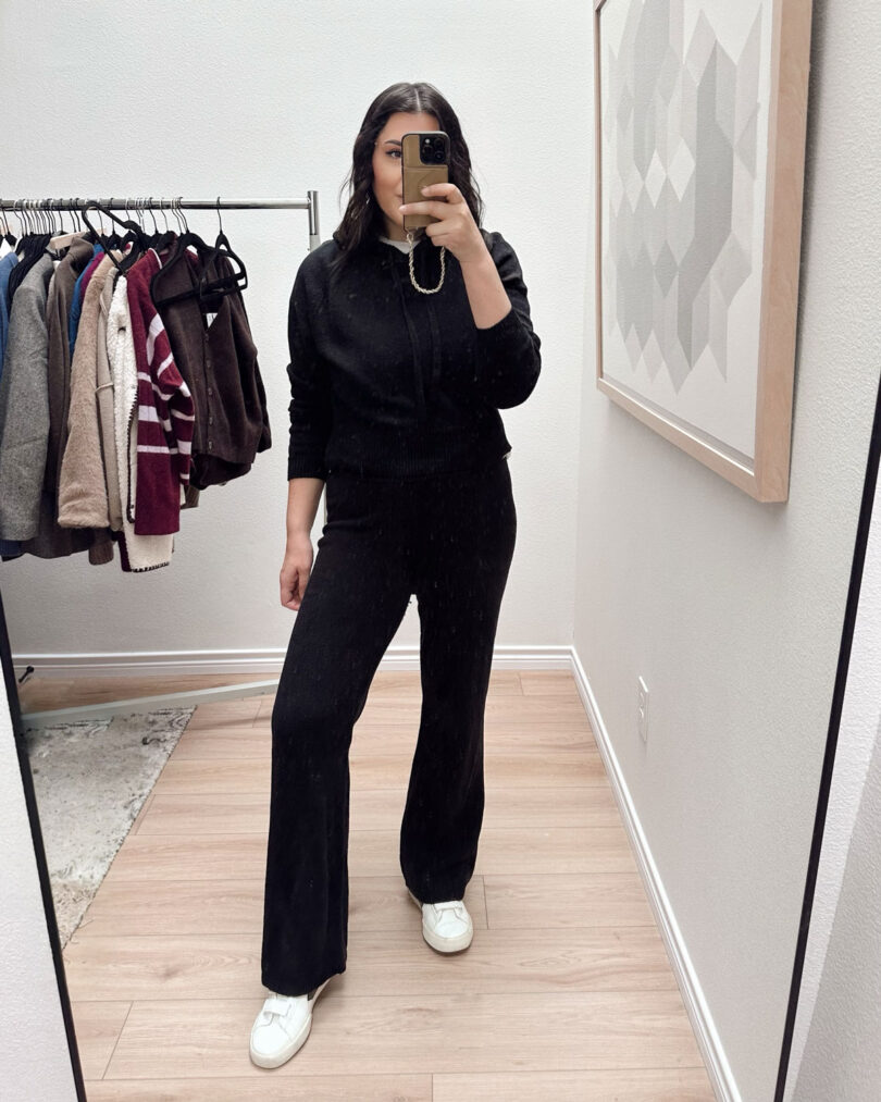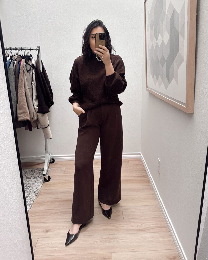 These trousers are basically sweatpants. But with a zipper, button fly and pockets. They don’t look like sweatpants on or even in person, but boy are they comfortable. If I traveled a lot, these would be my go-to pant to be honest. I wear these when I don’t want to actually get dressed, it’s a cheat code. Plus this sweater is big and soft and cozy, so I look put together but I’m cozy AF here.