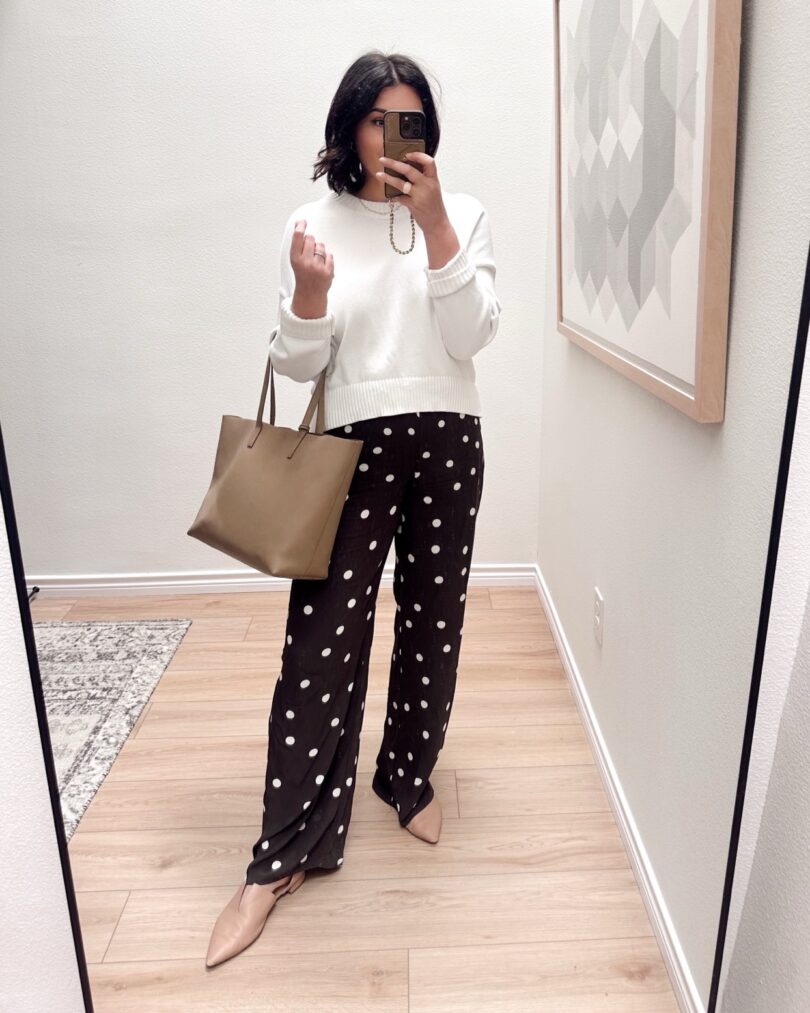 It’s the damn polka dot pants again. I love them so much. They’re so comfortable but also so chic. I paired it with yet another Quince sweater…but also my favorite Quince sweater. It’s under $40 and is 100% cotton. I’m in the medium, it runs generously.