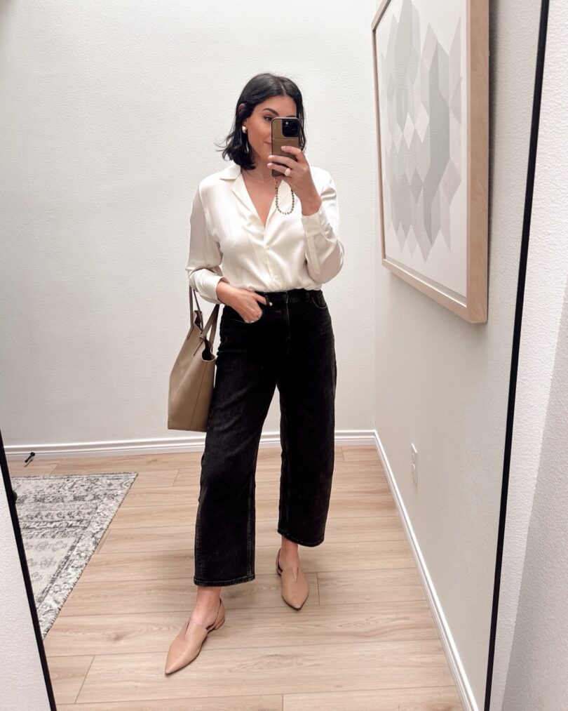 This post should just be called jeans and a Quince top because…looky here. Another Quince top. It is my favorite silk top, though. I sized up for a looser fit.