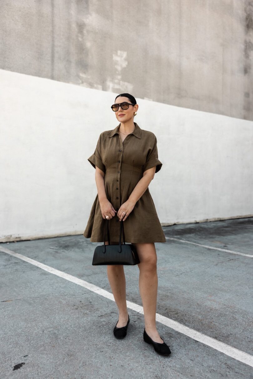 The moment I tried this dress on I knew this was going to be a regular rotation piece. This dress fits really well on an hourglass figure OR an apple that wants to be mistaken for an hourglass figure. The button-front shirtdress silhouette is a classic for a reason: it nips in through the bodice, then flows out into a relaxed A-line shape. I went with the large, as I’m in between a medium and large right now and it was spot on. I would say it runs slightly generous overall so it’s not tight at all but still very flattering. The linen keeps its silhouette too, it’s a thicker linen but not hot.